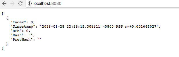 接著我們打開瀏覽器,訪問 localhost:8080 這個地址,我們可以看到頁面中展示了當前整個區(qū)塊鏈的信息(當然,目前只有一個創(chuàng)世塊):