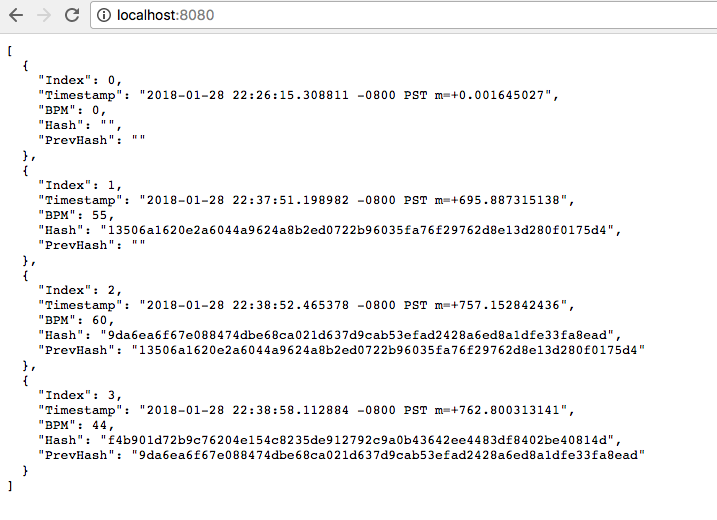 為了簡化,我們直接以 JSON 格式返回整個鏈,你可以在瀏覽器中訪問 localhost:8080 或者 127.0.0.1:8080 來查看(這里的8080就是你在 .env 中定義的端口號 ADDR)。