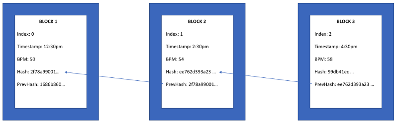 - 維持鏈的完整性。通過存儲前一個塊的散列值,我們就能夠確保每個塊在鏈中的正確順序。任何對數(shù)據(jù)的篡改都將改變散列值,同時也就破壞了鏈。以我們從事的醫(yī)療健康領(lǐng)域為例,比如有一個惡意的第三方為了調(diào)整“人壽險”的價格,而修改了一個或若干個塊中的代表不健康的 BPM 值,那么整個鏈都變得不可信了。