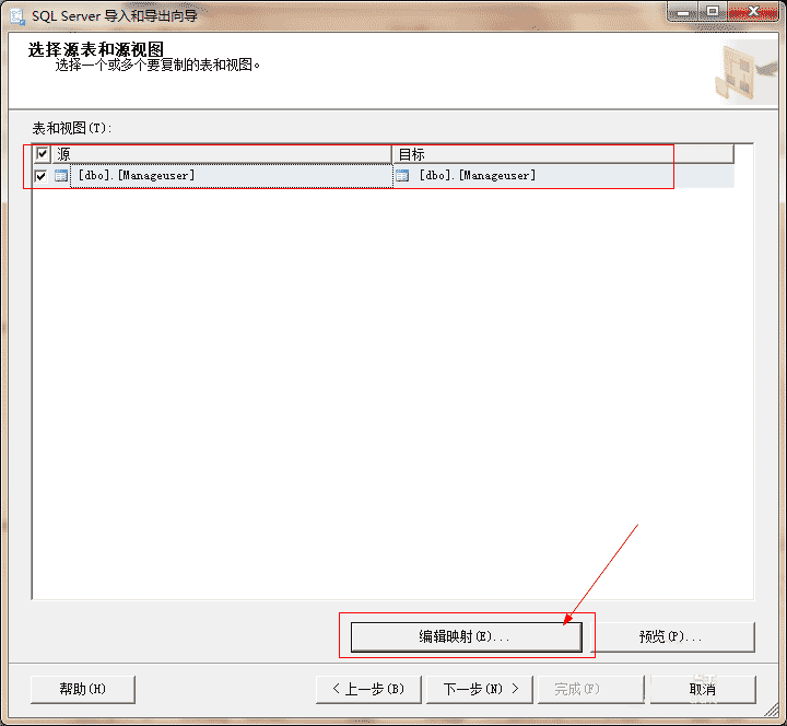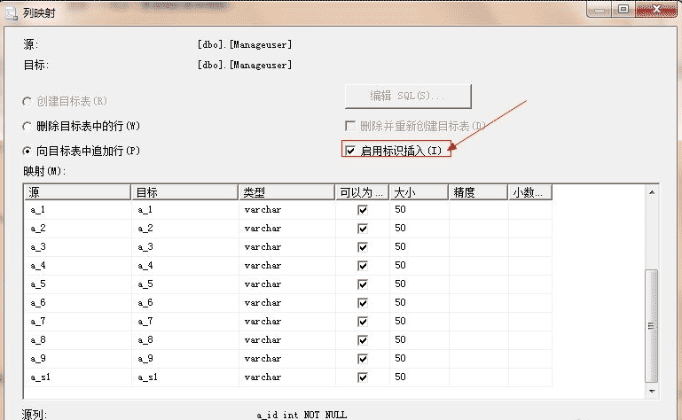 選擇源表和源視圖:設(shè)置源表和目標(biāo)表后,單擊“編輯映射”按鈕,在彈出窗口中選中“啟用標(biāo)識插入”。(否則后面會出錯)