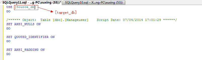 新建查詢,然后右鍵”粘貼“(或ctrl+v);如圖所示,將代碼中Source_db(源數(shù)據(jù)庫名)改為target_db(目標(biāo)數(shù)據(jù)庫名)。接著右鍵單擊”執(zhí)行“執(zhí)行代碼。