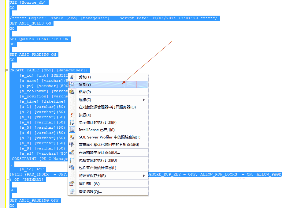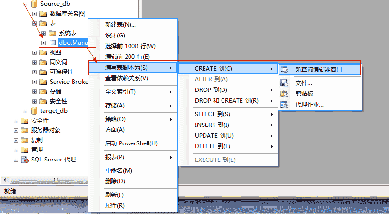 首先,打開并連接Sql Server,在源數(shù)據(jù)庫Source_db(源數(shù)據(jù)庫名稱)上右鍵,然后依次點(diǎn)擊“編寫表腳本為”→“CREATE到”→“新查詢編輯器窗口”。