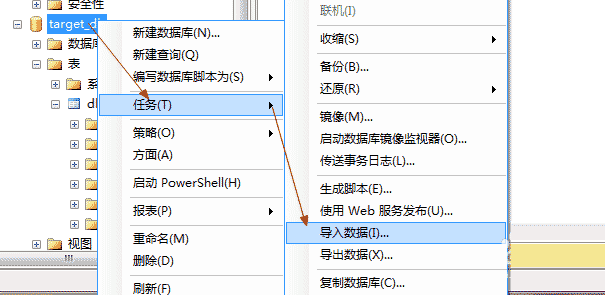 選中目標(biāo)數(shù)據(jù)庫target_db,然后點(diǎn)擊”任務(wù)“→”導(dǎo)入數(shù)據(jù)“。
