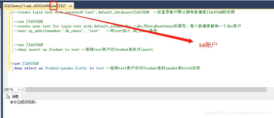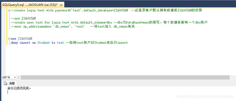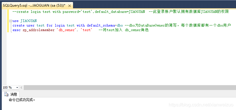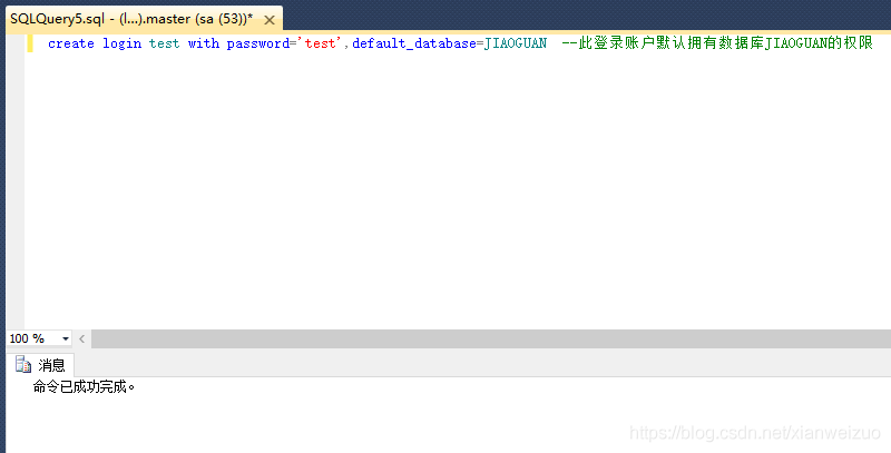create login test with password='test',default_database=JIAOGUAN --此登錄賬戶默認(rèn)擁有數(shù)據(jù)庫JIAOGUAN的權(quán)限