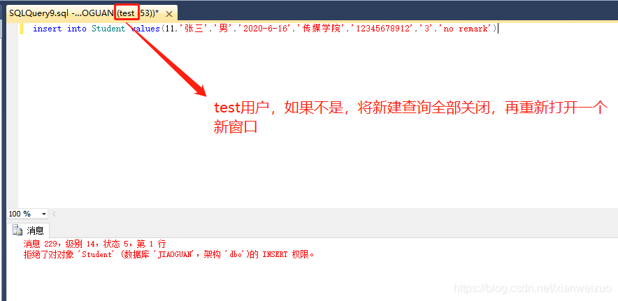 此時,使用test用戶登錄,并嘗試對Student表插入數(shù)據(jù),會提示錯誤,注意:使用test用戶登錄