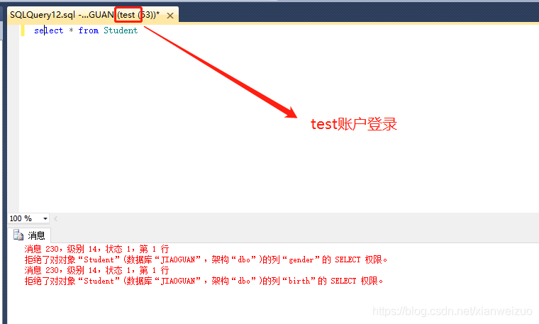 使用test賬戶登錄之后,嘗試使用select * from Student,將提示錯誤