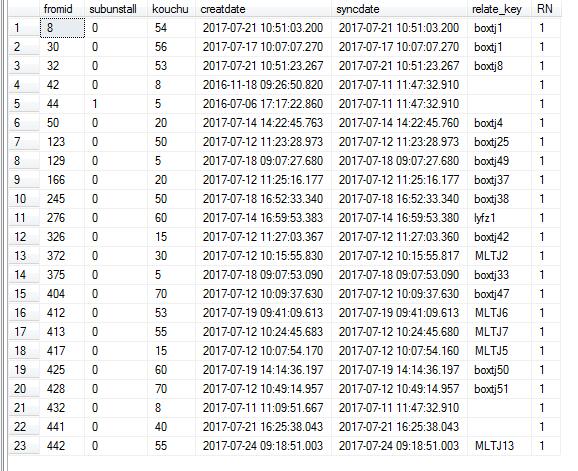 select fromid,subunstall,kouchu,creatdate,syncdate,relate_key from BoxCount_Froms_Open