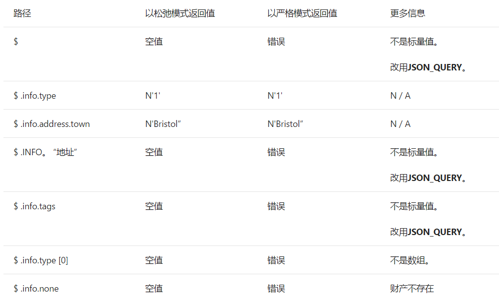要從JSON字符串而不是標(biāo)量值中提取對象或數(shù)組,請參閱JSON_QUERY(Transact-SQL)。有關(guān)JSON_VALUE和JSON_QUERY之間的差異的信息,請參閱比較JSON_VALUE和JSON_QUERY。