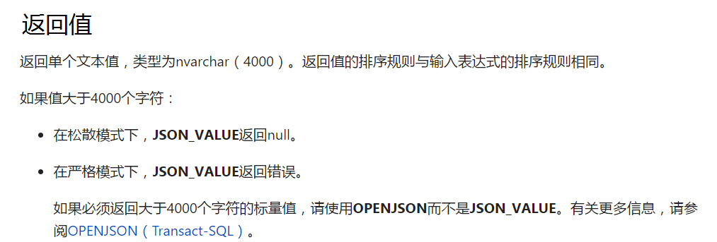 - JSON_VALUE 和 JSON_QUERY 函數(shù)轉(zhuǎn)移和獲取Varchar格式的數(shù)據(jù),因此必須將數(shù)據(jù)轉(zhuǎn)譯成你需要的類型。