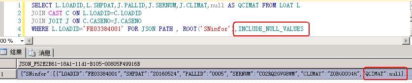 為NULL的數(shù)據(jù)在輸出JSON時,會被忽略,若想要讓NULL的字段也顯示出來,可以加上選項INCLUDE_NULL_VALUES,該選項也適用于AUTO。