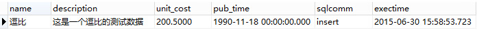 VALUES('逗比','這是一個逗比的測試數(shù)據(jù)',200.5,'1990-11-18')
