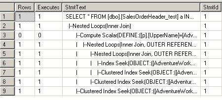 1 USE [AdventureWorks] 2 GO 3 DROP PROC Sniff2 4 GO 5 CREATE PROC Sniff2(@i INT) 6 AS 7 DECLARE @j INT 8 SET @j=@i 9 SELECT COUNT(b.[SalesOrderID]),SUM(p.[Weight])10 FROM [dbo].[SalesOrderHeader_test] a11 INNER JOIN [dbo].[SalesOrderDetail_test] b12 ON a.[SalesOrderID]=b.[SalesOrderID]13 INNER JOIN [Production].[Product] p14 ON b.[ProductID]=p.[ProductID]15 WHERE a.[SalesOrderID]=@j16 GO