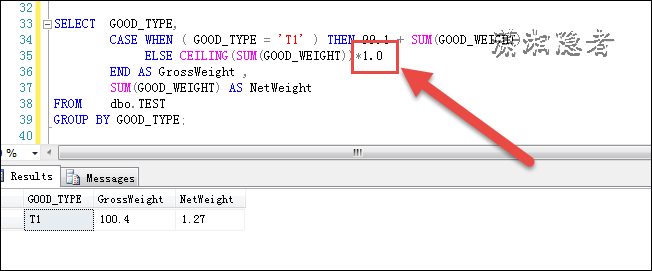 如上所示,為什么99.1 + SUM(GOOD_WEIGHT)變成100了呢? 原始SQL非常復(fù)雜,我們分析、排除掉各個(gè)因素后,始終不得要領(lǐng),各種折騰中發(fā)現(xiàn),如果這樣轉(zhuǎn)換一下(請(qǐng)見下面截圖),居然就OK了,后面分析了一下,應(yīng)該是CASE WHEN里面的不同數(shù)據(jù)類型導(dǎo)致隱式轉(zhuǎn)換,說(shuō)實(shí)話之前還真沒有留意CASE WHEN中存在數(shù)據(jù)類型的隱性轉(zhuǎn)換,但是為什么就一定從NUMERIC轉(zhuǎn)換為INT了呢? 而不是INT隱性轉(zhuǎn)換為NUMERIC呢, 說(shuō)實(shí)話沒有看到相關(guān)文檔的官方,如果按照官方文檔: