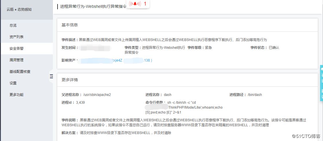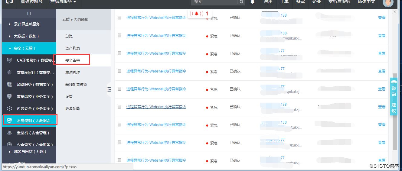 此時(shí),php的項(xiàng)目源碼分布在好幾臺(tái)服務(wù)器上,如果靠傳統(tǒng)方式去排查,挨個(gè)檢查這些服務(wù)器的目錄,各種能用的命令都用上了,是不是也挺費(fèi)勁費(fèi)時(shí)的,還不知道要查到啥時(shí)候。這個(gè)時(shí)候,阿里有項(xiàng)服務(wù)起到關(guān)鍵的作用了:“態(tài)勢(shì)感知”,這個(gè)需要升級(jí)為企業(yè)版本(費(fèi)用不高,我們公司開(kāi)通了一年,費(fèi)用6000多塊)。這就是用阿里的好處(不是打廣告),確實(shí)讓你省心。