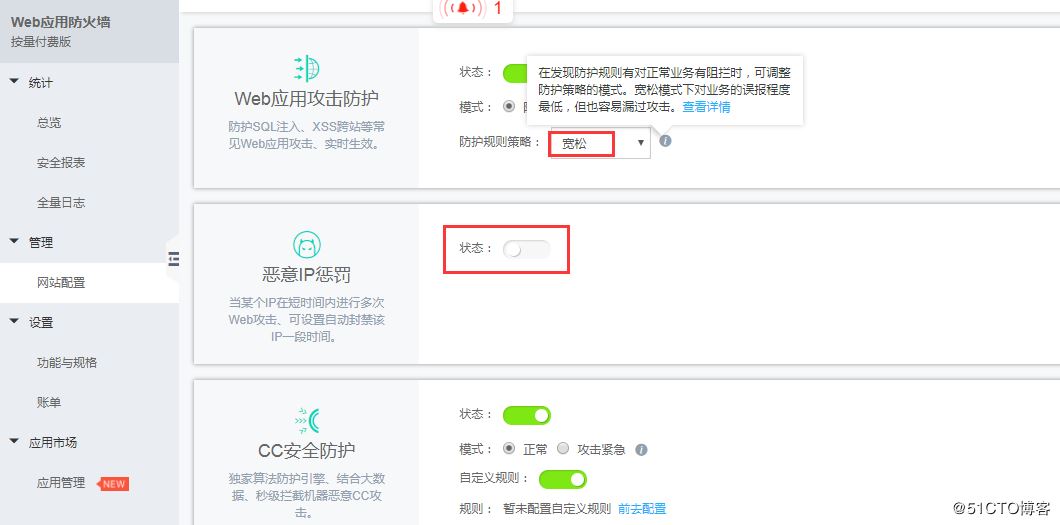 從上圖可以看出,“Web應(yīng)用防護(hù)”策略是寬松模式,其主要作用就是防護(hù)SQL注入、XSS跨站等常見(jiàn)Web應(yīng)用,寬松模式下對(duì)業(yè)務(wù)的誤報(bào)程度最低,但也容易漏過(guò)***?!皭阂釯P懲罰”也沒(méi)啟用。這么寬松的防護(hù)措施風(fēng)險(xiǎn)比較大。趕緊先調(diào)整吧。