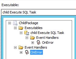 默認(rèn)情況下,當(dāng)前Task組件的事件處理程序中把錯誤(Error)事件處理之后,SSIS引擎仍然把錯誤事件向上層事件處理程序傳遞,直到包層次結(jié)構(gòu)的最頂層,如下圖,在ChildPackage的Package級別和Executable級別上分別創(chuàng)建了OnError事件處理程序,Executable級別是child Execute SQL Task: