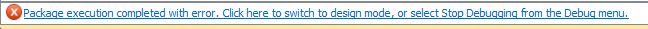 但是,錯誤事件沒有停止,而是繼續(xù)向上傳遞,被其直接上級,也就是Package級別的OnError事件處理程序捕獲,如下圖,來自子Task組件的錯誤事件被父級處理之后,Package仍然報(bào)錯,錯誤消息是:Package execution completed with error.