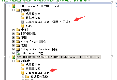 日志傳送配置成功后:輔助數(shù)據(jù)庫標(biāo)識為(備用/只讀)如下圖