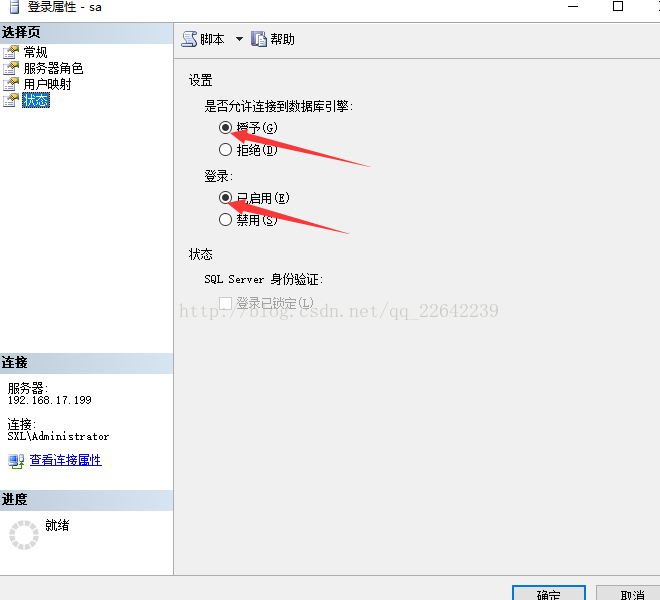 然后 點(diǎn)擊 連接實(shí)例下 的 安全性--->sa--->狀態(tài),如下圖所示:
