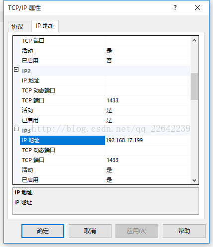 將你的本機(jī)的ip地址輸入到 IP3 中 我的本機(jī)的IP地址是192.168.17.199 將 TCP動(dòng)態(tài)端口設(shè)為空,TCP端口設(shè)為1433 下面 活動(dòng)和已啟用 選項(xiàng)改為 是