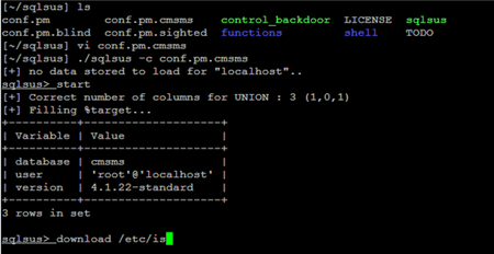 sqlsus是一個(gè)開(kāi)放源代碼的MySQL注入和接管工具,sqlsus使用perl編寫(xiě)并基于命令行界面。sqlsus可以獲取數(shù)據(jù)庫(kù)結(jié)構(gòu),注入你自己的SQL語(yǔ)句,從服務(wù)器下載文件,爬行web站點(diǎn)可寫(xiě)目錄,上傳和控制后門,克隆數(shù)據(jù)庫(kù)等。