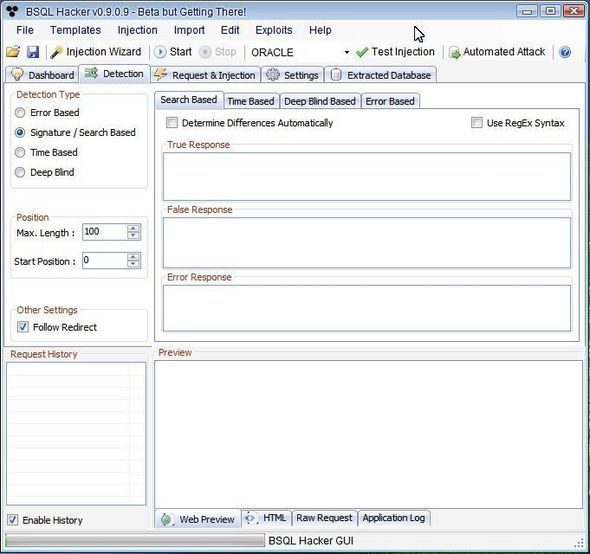 BSQL Hacker是由Portcullis實(shí)驗(yàn)室開(kāi)發(fā)的,BSQL Hacker 是一個(gè)SQL自動(dòng)注入工具(支持SQL盲注),其設(shè)計(jì)的目的是希望能對(duì)任何的數(shù)據(jù)庫(kù)進(jìn)行SQL溢出注入。 BSQL Hacker的適用群體是那些對(duì)注入有經(jīng)驗(yàn)的使用者和那些想進(jìn)行自動(dòng)SQL注入的人群。BSQL Hacker可自動(dòng)對(duì)Oracle和MySQL數(shù)據(jù)庫(kù)進(jìn)行攻擊,并自動(dòng)提取數(shù)據(jù)庫(kù)的數(shù)據(jù)和架構(gòu)。