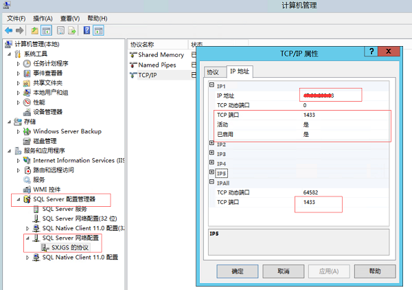 2. 服務器上 win + R 鍵入 compmgmt.msc ,打開 計算機管理,按照如圖所示 設(shè)置。注:IPAll 一欄 TCP端口必須設(shè)置,不然連接不上?。?! 設(shè)置完成后,重啟一下 Sql Server 服務。