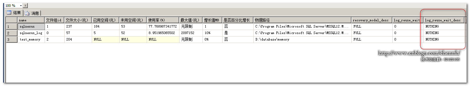 通過log_reuse_wait_desc的狀態(tài)可以看到當(dāng)前數(shù)據(jù)庫已經(jīng)無需日志備份,當(dāng)然我已經(jīng)執(zhí)行過日志備份。