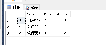 select Id,Name,ParentId,0 lv -- 查詢出“根節(jié)點”,即指定的起始節(jié)點