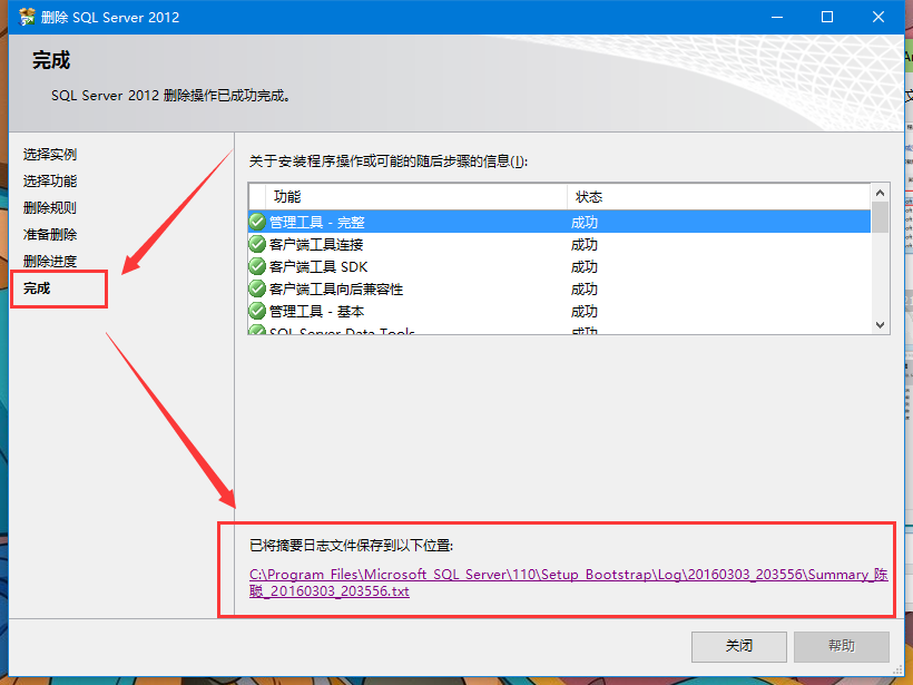 當(dāng)這一步也完成了,那么SQL server 2012已經(jīng)卸載完成了一大半,現(xiàn)在只需要將C盤(pán)里面的一些文件刪除和刪除注冊(cè)表就行