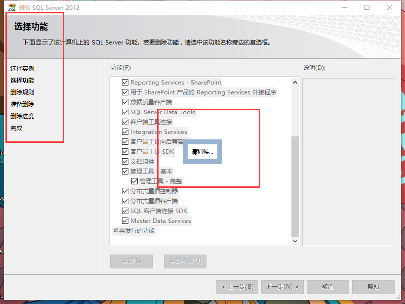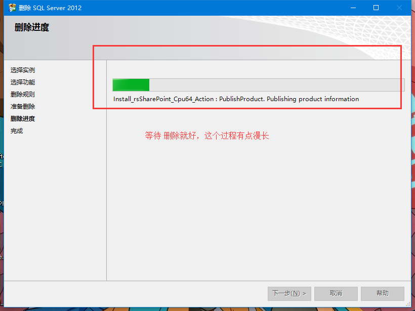 第五步,當(dāng)?shù)搅藴?zhǔn)備刪除時(shí)候,點(diǎn)擊下一步,由于SQL server 2012真的很大,刪除進(jìn)度這一步很慢,大概需要半個(gè)小時(shí)時(shí)間,只需要慢慢等待就行。