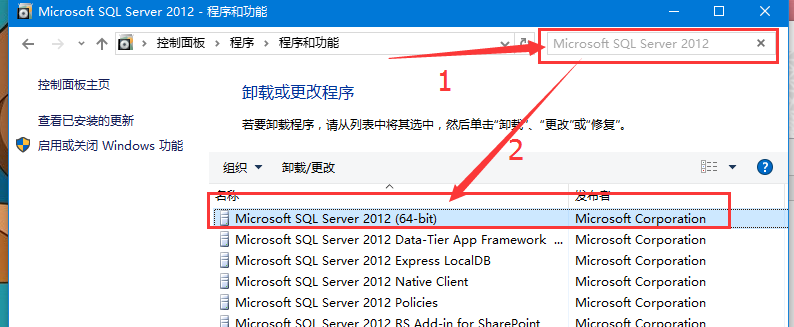 第二步,經(jīng)過(guò)第一步打開(kāi)卸載程序后,在里面找到Microsoft SQLserver 2012 (64-bit)這一項(xiàng),可以通過(guò)右上角搜索框?qū)ふ?/p>