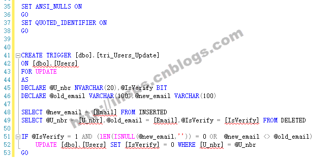 當(dāng)用戶更改郵箱成功時,需要同進(jìn)對[IsVerify] 更改為false。因此你需要對最開始的表寫一個觸發(fā)器: