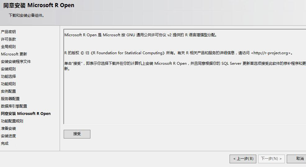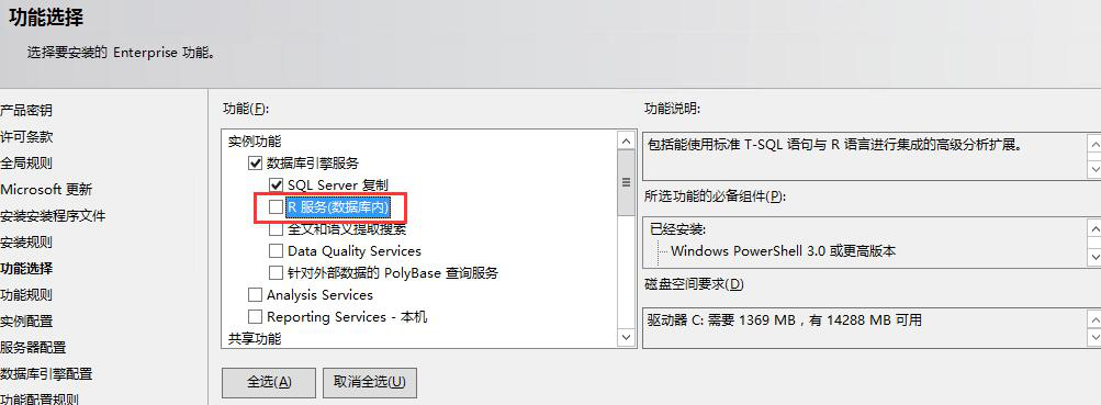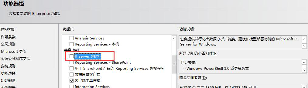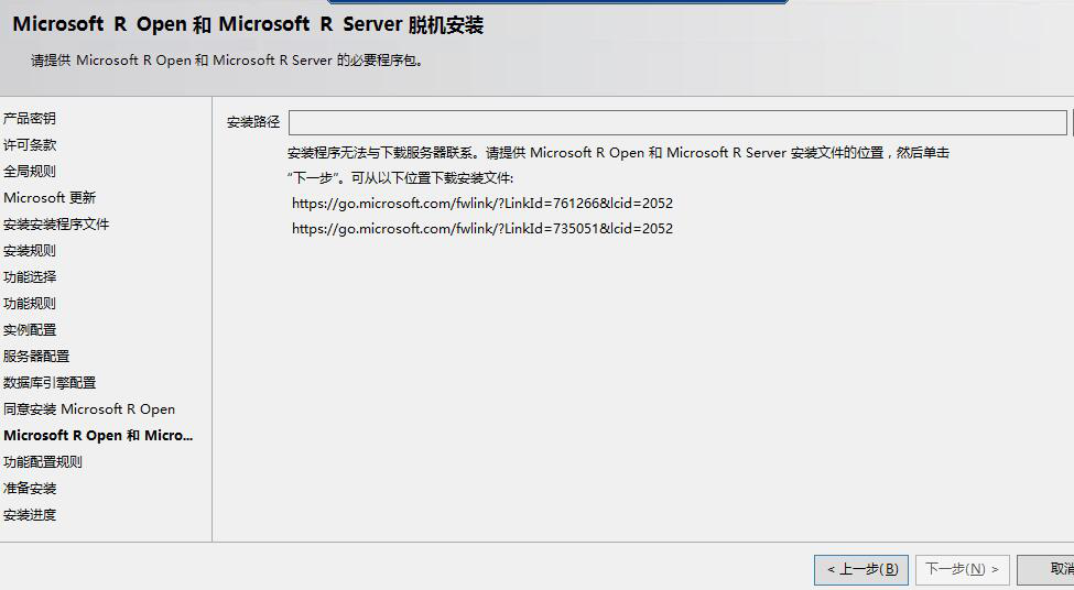 功能選擇里多出來的R Server,但是R Server需要聯(lián)網(wǎng)或者自己下載下來,這是坑爹的地方之一,它沒有集成在SQL Server2016安裝包里