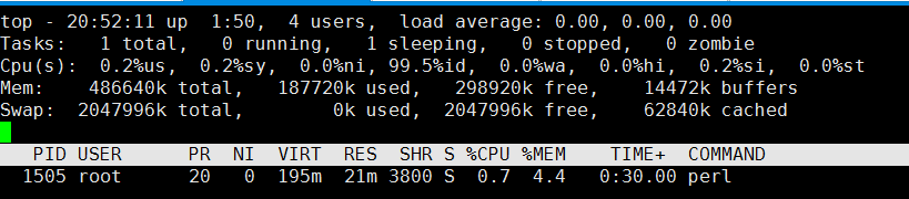 同樣CPU時間后,MEM增長到4.4%, 增長了1%,考慮到內(nèi)存500M,該進(jìn)程的內(nèi)存占用增加了5M,雖然不是很多,但考慮到進(jìn)程的內(nèi)存增加并沒有停止的意思,這個現(xiàn)象還是要引起注意的。