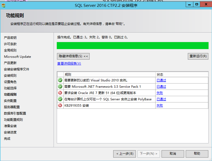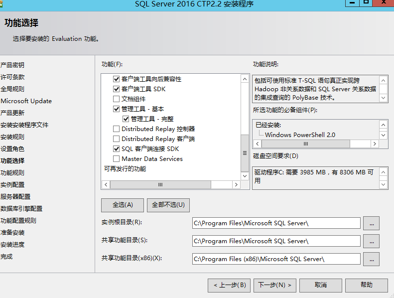 安裝過程中的第一個坑來了,如果你勾選了PolyBase,它是需要安裝JAVA JRE的,因為它需要調(diào)用JRE來查詢hadoop數(shù)據(jù)