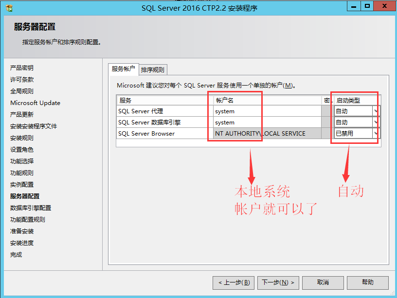 SQL服務(wù)和SQL 代理服務(wù)的啟動帳戶都使用本地系統(tǒng)帳戶 localsystem,啟動類型為自動