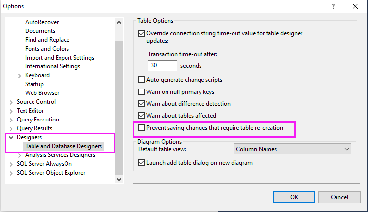 以上就是SQL Server 阻止保存要求重新創(chuàng)建表的更改問題的設(shè)置方法,希望對(duì)大家有所幫助,謝謝大家的閱讀。