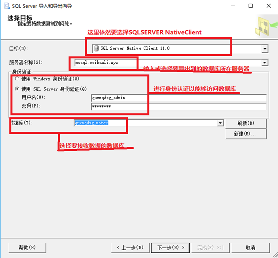 3.設置目標數(shù)據(jù)庫,導出到的數(shù)據(jù)庫信息