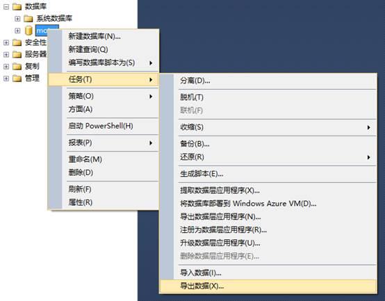 1.準備源數(shù)據(jù)庫,找到想要導出的數(shù)據(jù)庫,右鍵選擇"任務"再選擇"導出數(shù)據(jù)"