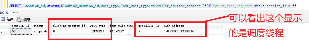 sys.dm_os_waiting_tasks里在并行計(jì)劃的執(zhí)行中出現(xiàn)了 CXPACKET 和 LCK_M_S 那么我們來看一下 sys.dm_exec_requests 里是如何顯示的(這里只取出試驗(yàn)用的字段)