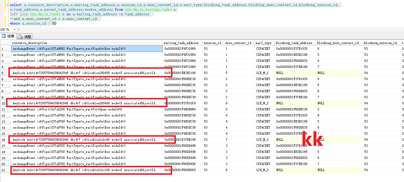 查看sys.dm_os_waiting_tasks (3篇文章的語(yǔ)句代碼為了方便全都截圖的,情景模擬的代碼都很簡(jiǎn)單,就不貼出來(lái)了)