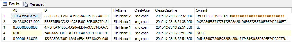 SELECT DATALENGTH(CONTENT)/(1024.0 * 1024.0) AS MB,* FROM ATTACHMENT