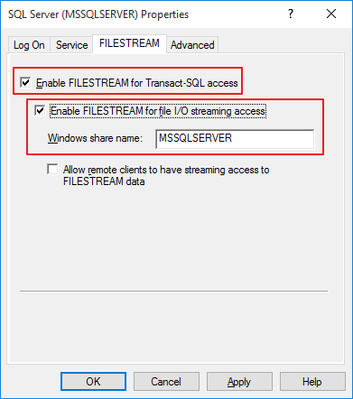 右擊屬性,切換到FILESTREAM標(biāo)簽,勾選如下配置