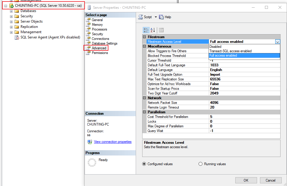 Exec sp_configure filesteam_access_level, 2