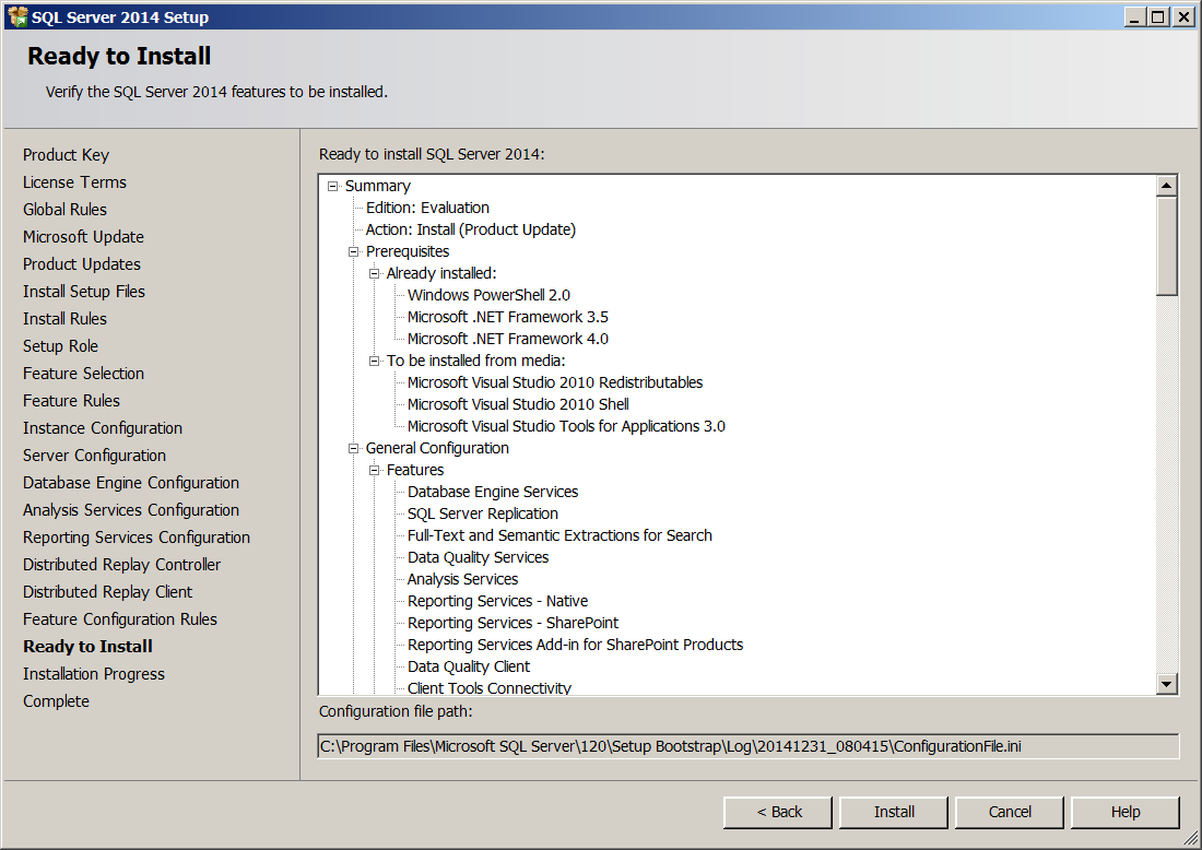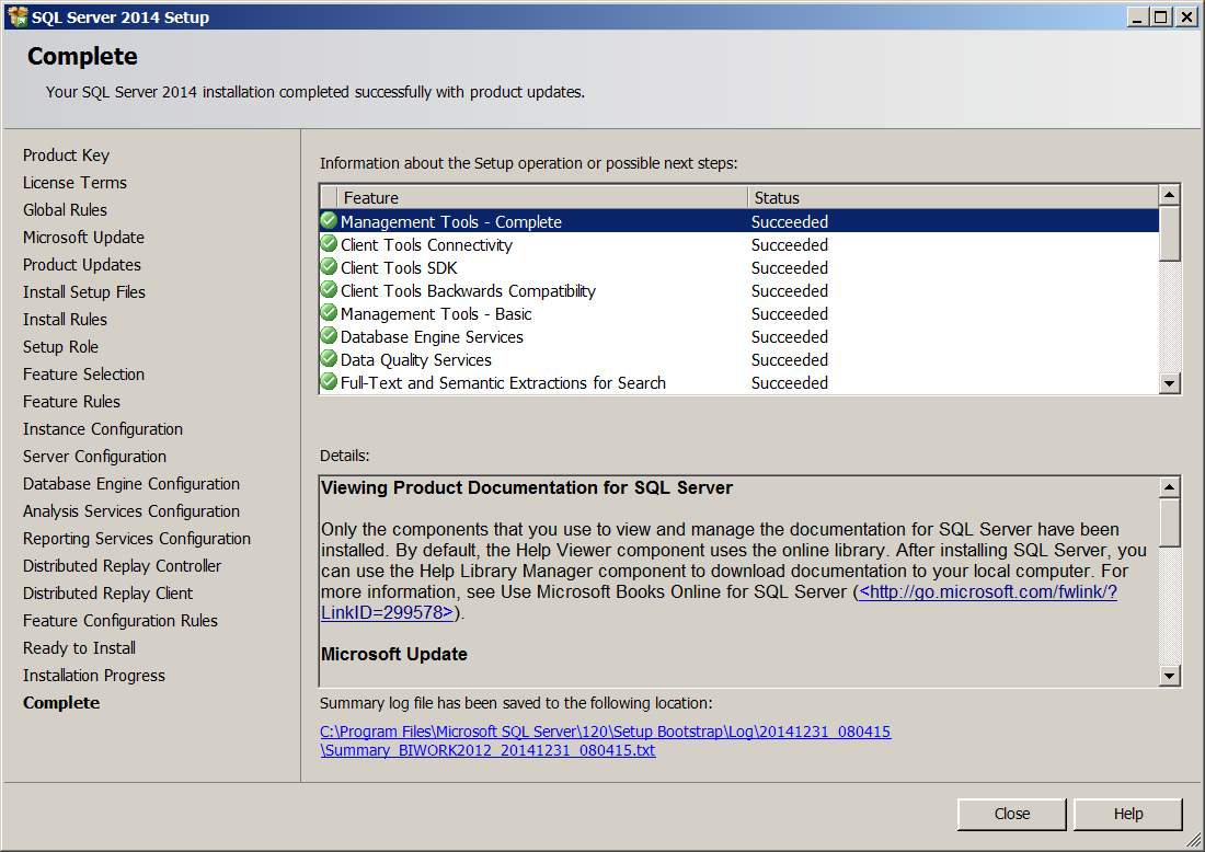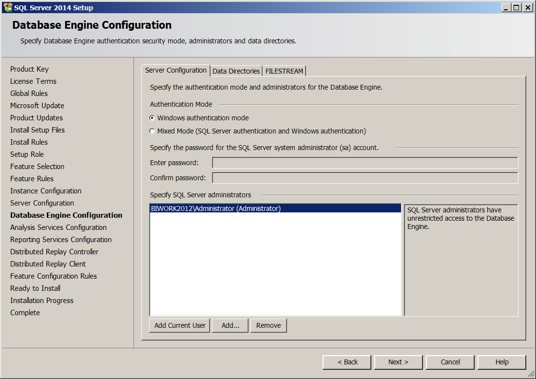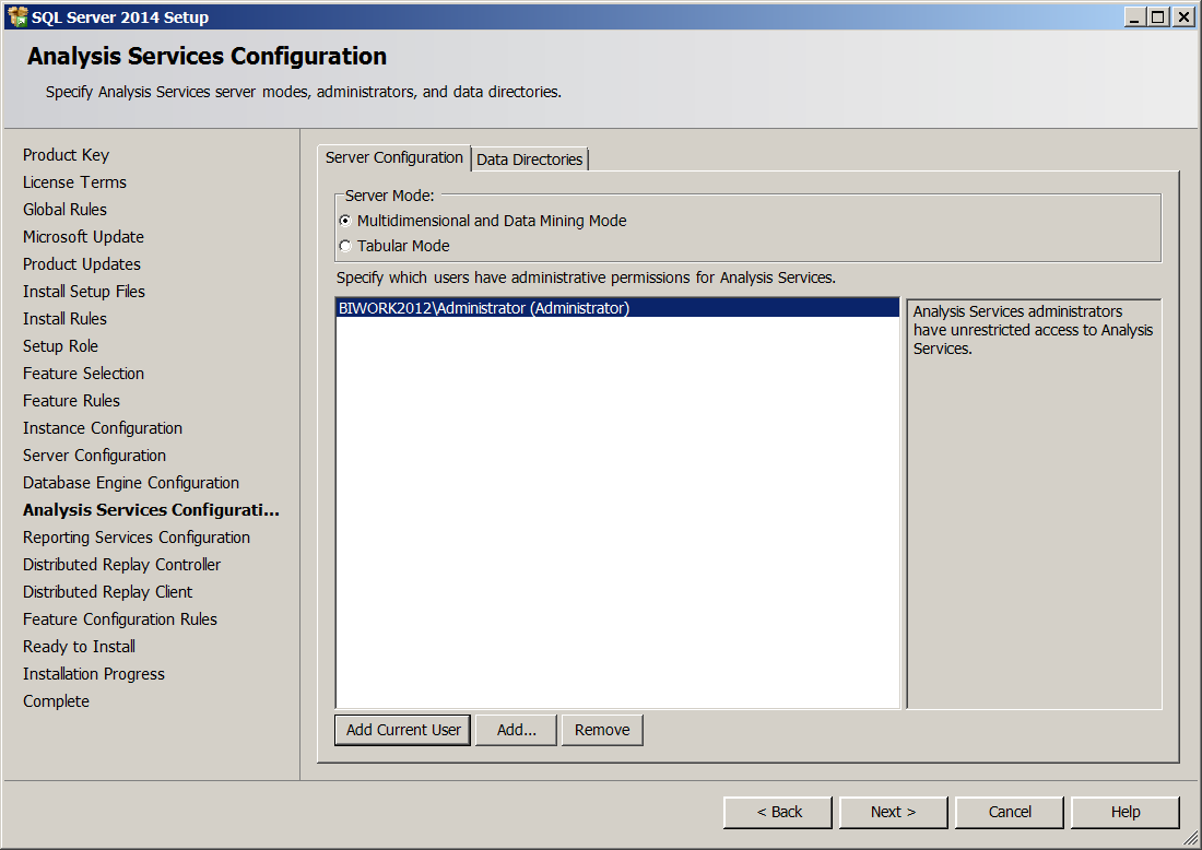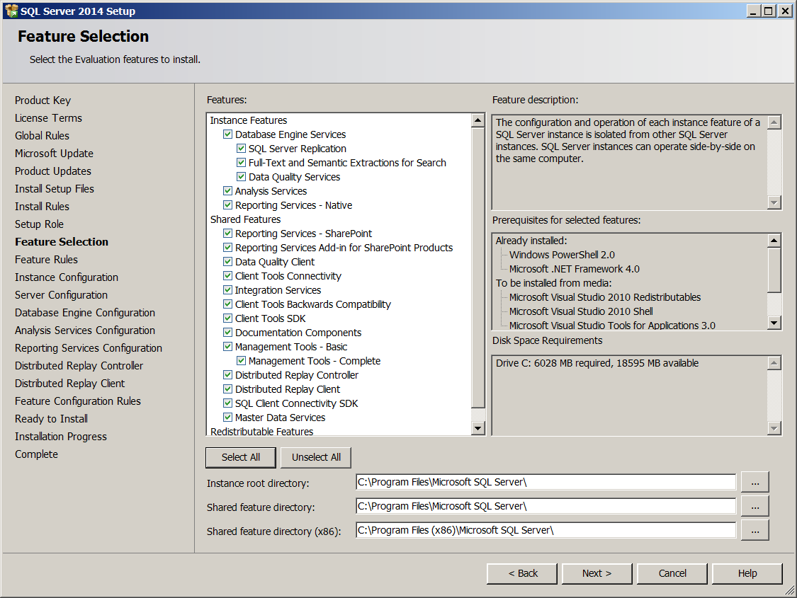 默認(rèn)全部安裝,雖然 BI 只需要用到 SSIS, SSRS, SSAS 但是為了成功安裝還是全選了吧,反正虛機(jī)空間是足夠了的。