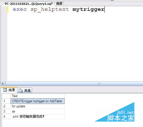 6 如果我們想查看某一個(gè)觸發(fā)器的內(nèi)容,直接運(yùn)行:exec sp_helptext [觸發(fā)器名]