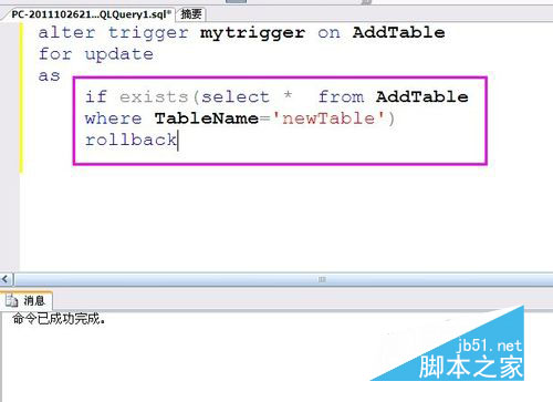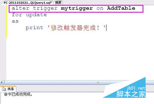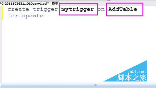 1 首先,我們來(lái)嘗試創(chuàng)建一個(gè)觸發(fā)器,要求就是在AddTable這個(gè)表上創(chuàng)建一個(gè)Update觸發(fā)器,語(yǔ)句為: