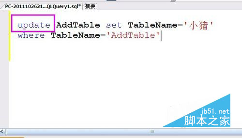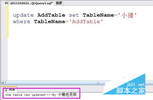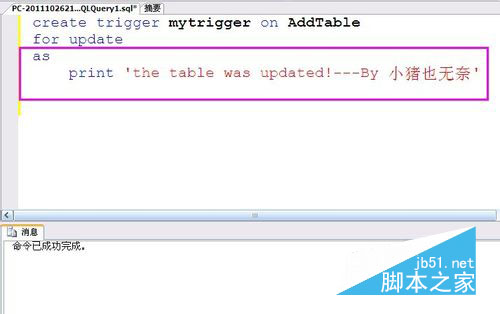 2 然后就是sql語(yǔ)句的部分了,主要是如果發(fā)生update以后,要求觸發(fā)器觸發(fā)一個(gè)什么操作。這里的意思就是如果出現(xiàn)update了,觸發(fā)器就會(huì)觸發(fā)輸出:the table was updated!---By 小豬也無(wú)奈。