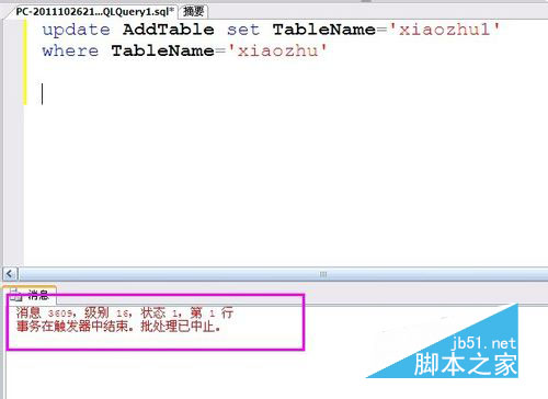 10 第九步的意思就是查詢(xún)AddTable表,如果里面存在TableName=newTable的,數(shù)據(jù)就回滾,觸發(fā)器中止,那我們?cè)龠M(jìn)行一下測(cè)試,對(duì)AddTable表進(jìn)行更改,發(fā)現(xiàn),觸發(fā)update觸發(fā)器之后,因?yàn)橛袛?shù)據(jù)保護(hù),觸發(fā)器中止: